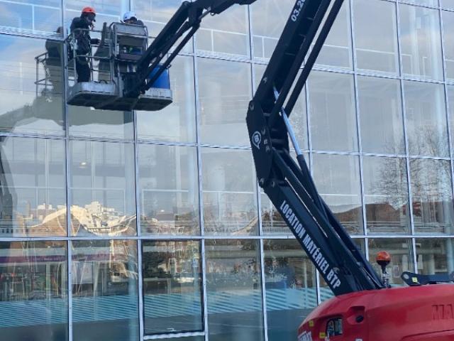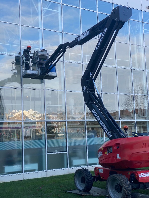 Aujourd'hui les équipes MENUISAL effectuent, à l'aide d'une nacelle de 20M, une intervention sur le bâtiment de la CPAM de Tourcoing pour remplacer les joints de serreurs sur les parties horizontales de la façade avant du mur-rideau.