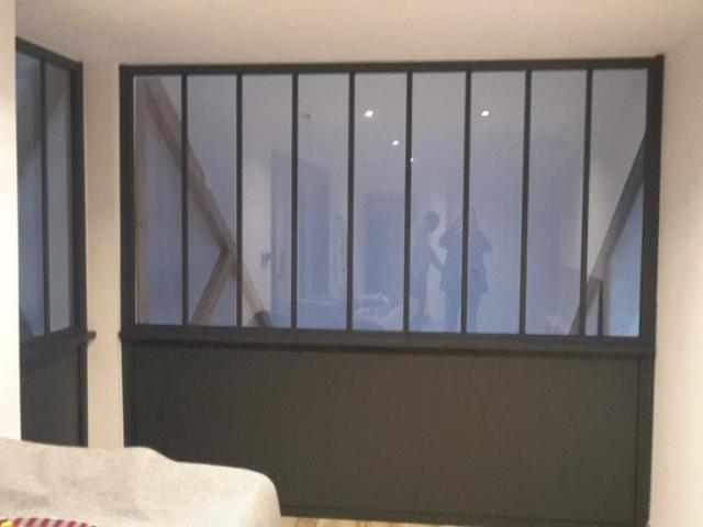 Menuiserie aluminium à Rosult style Atelier réalisé par Menuisal pour séparer l'étage du séjour qui est tout hauteur avec un soubassement plein et des "petits bois" en aluminium sur le vitrage. Série utilisée Reynaers TS 57.